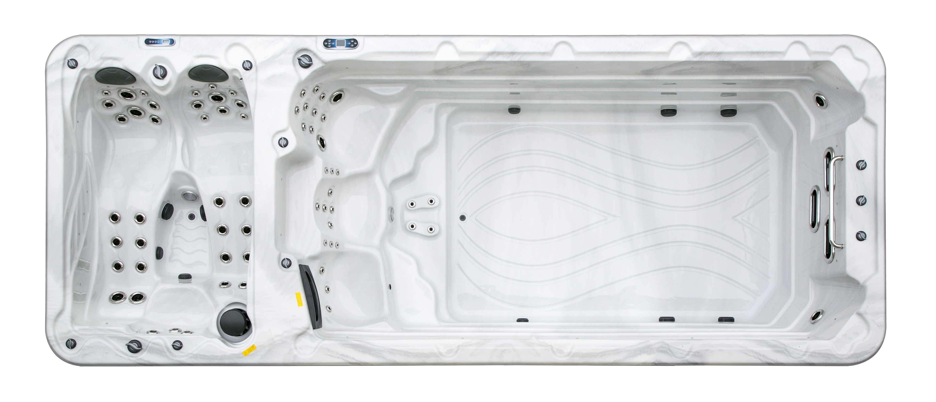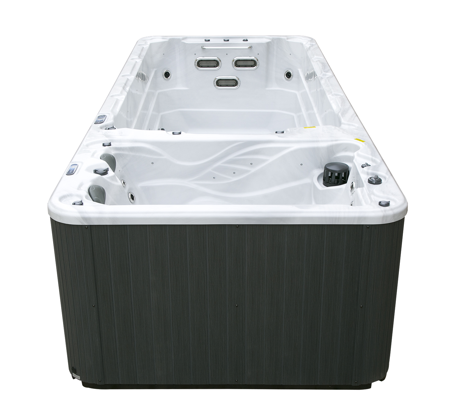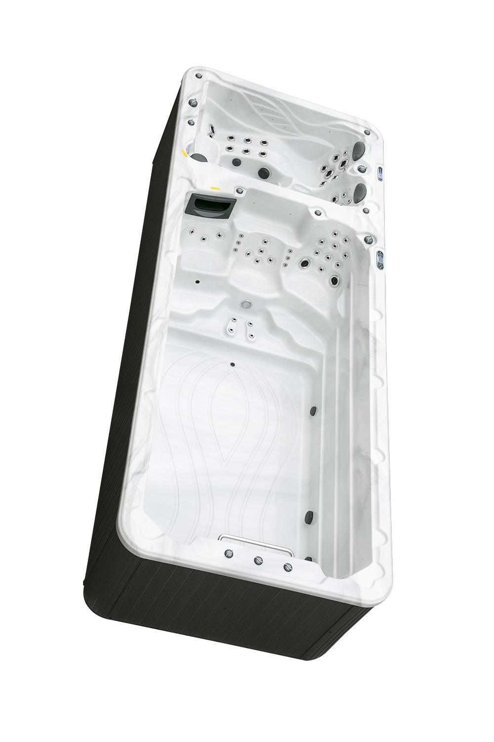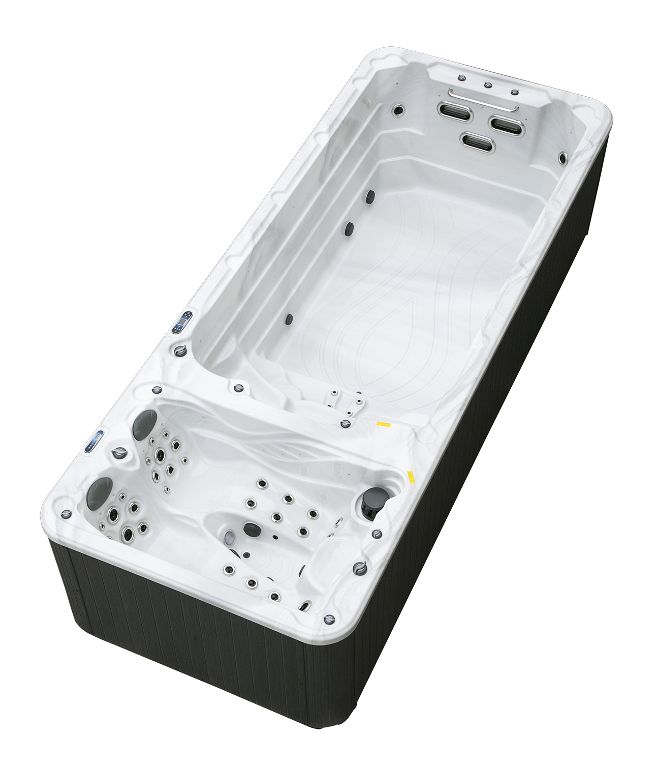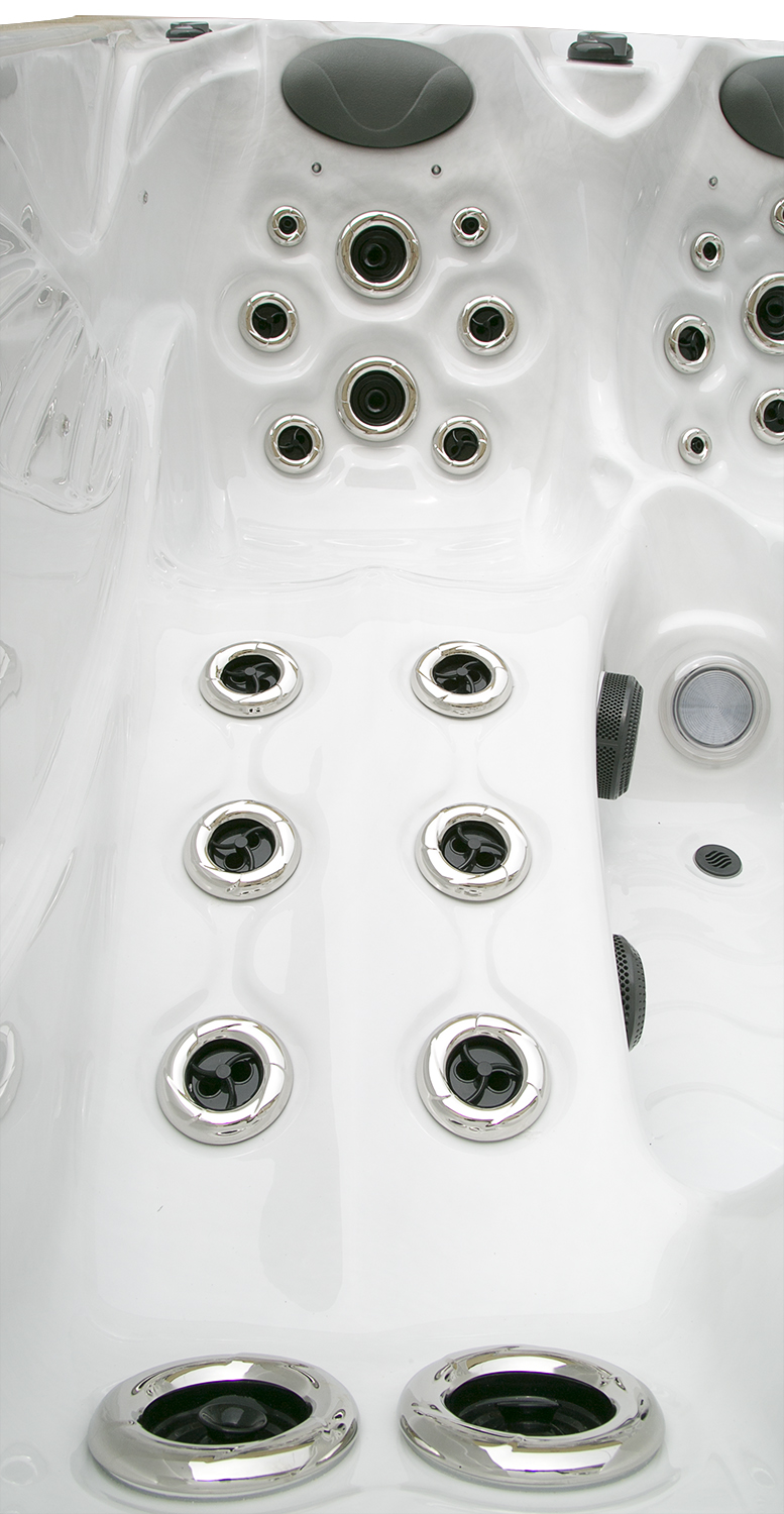 Два гидромассажных насоса по 1,5 кВт в сочетании с 76 форсунками обеспечивают интенсивный массаж и эффективную гидродинамику в спа-зоне. Мощный водяной насос на 2,9 кВт и форсунки противотока нового поколения создают идеальные условия для плавательных тренировок в главной части бассейна.