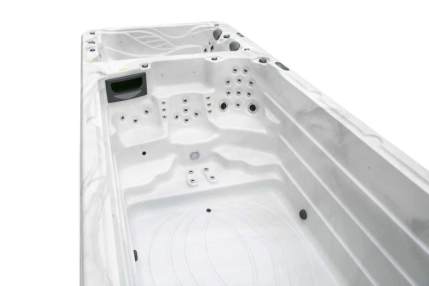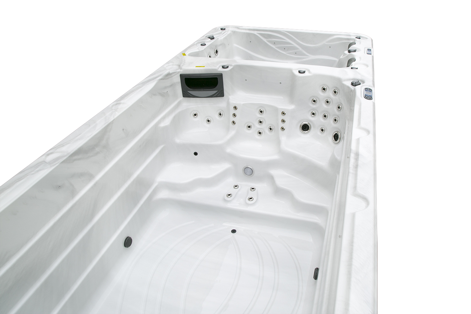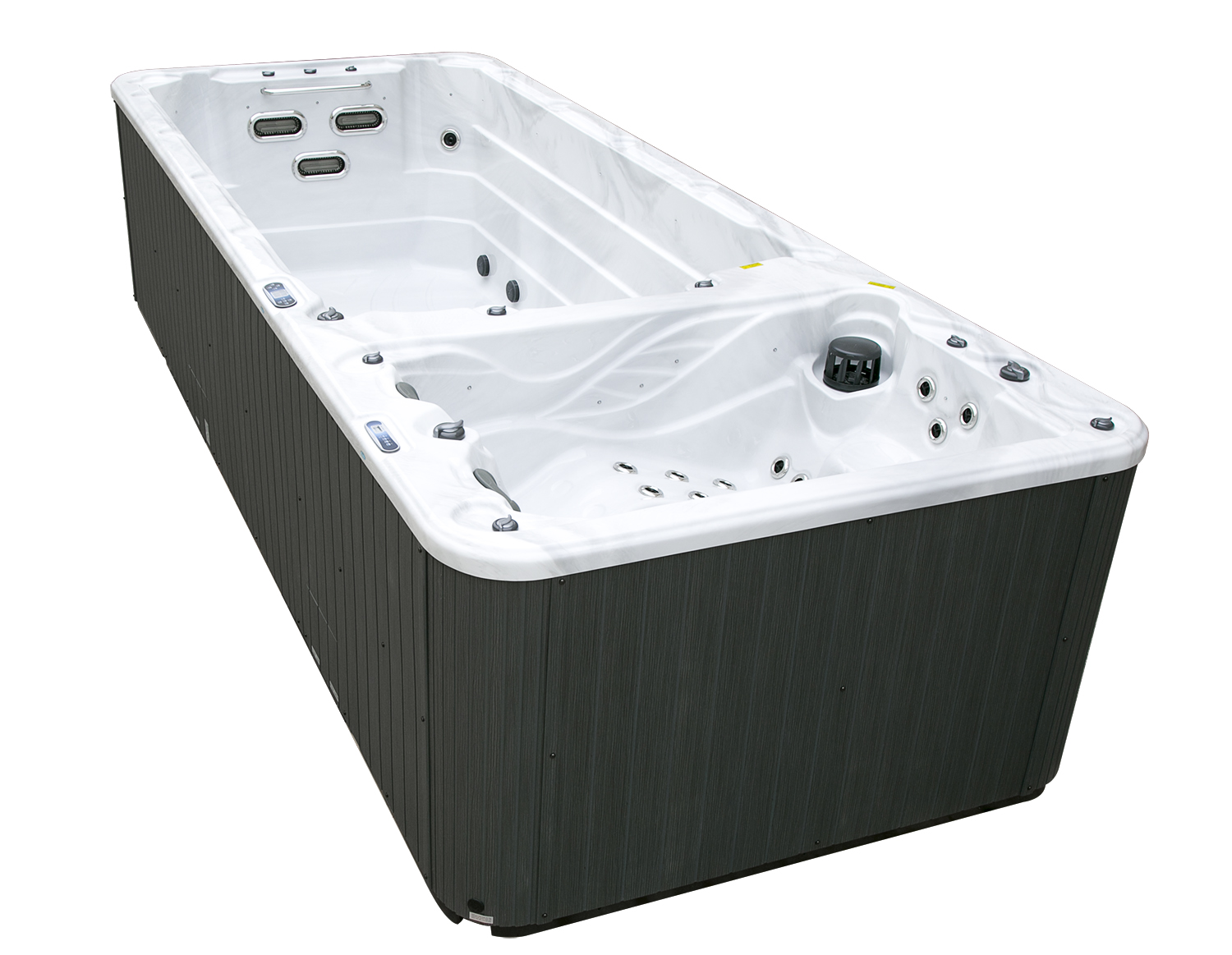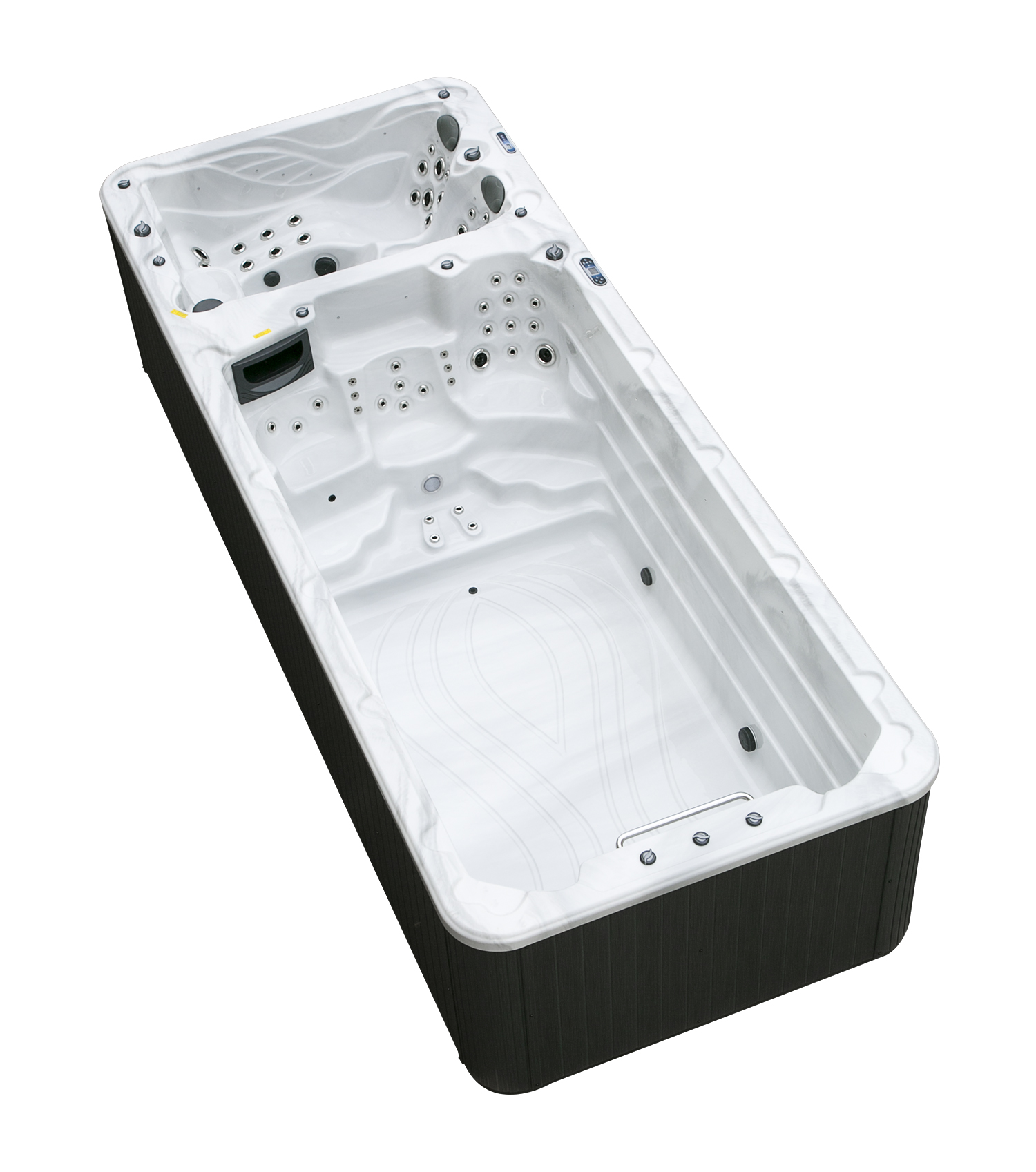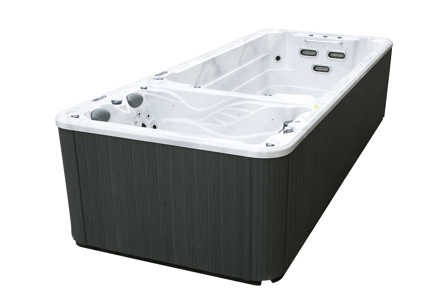Два гидромассажных насоса по 1,5 кВт в сочетании с 76 форсунками обеспечивают интенсивный массаж и эффективную гидродинамику в спа-зоне. Мощный водяной насос на 2,9 кВт и форсунки противотока нового поколения создают идеальные условия для плавательных тренировок в главной части бассейна.