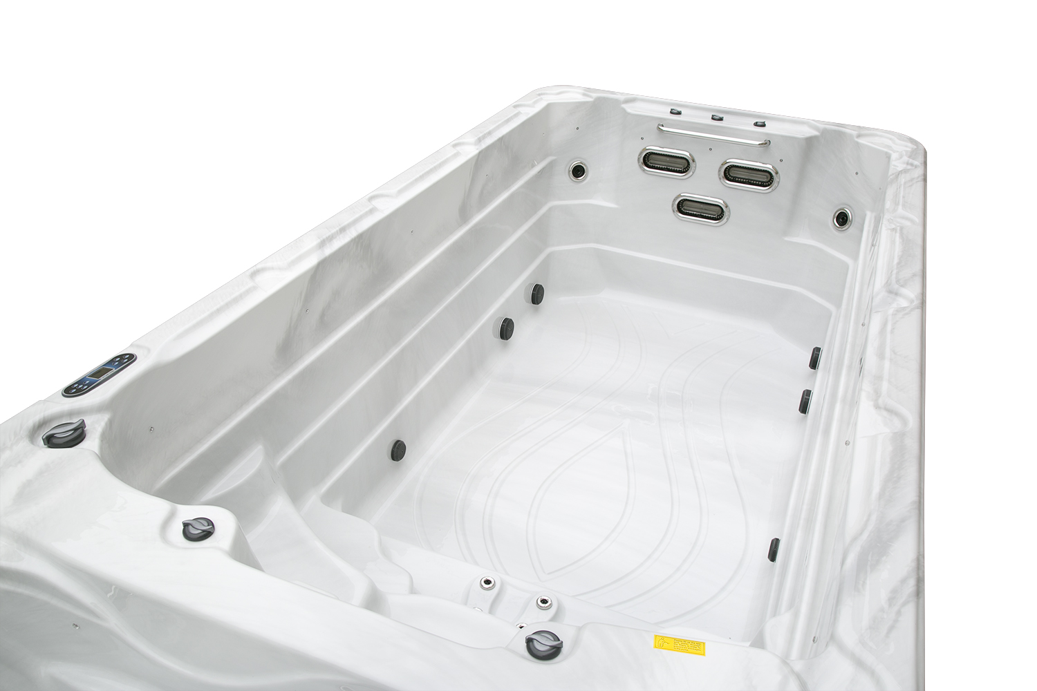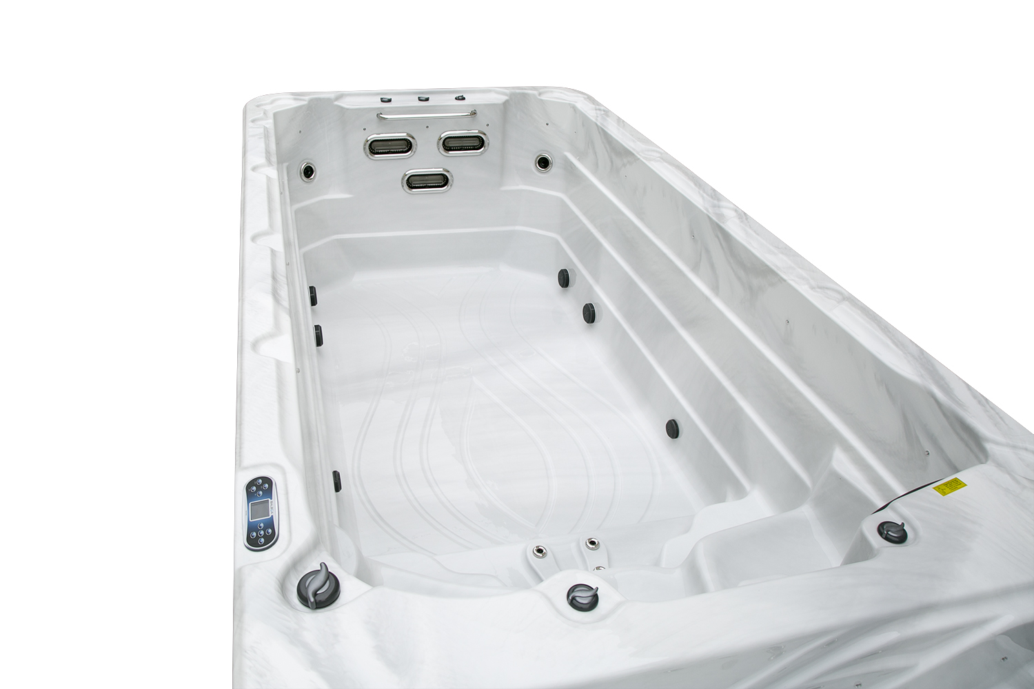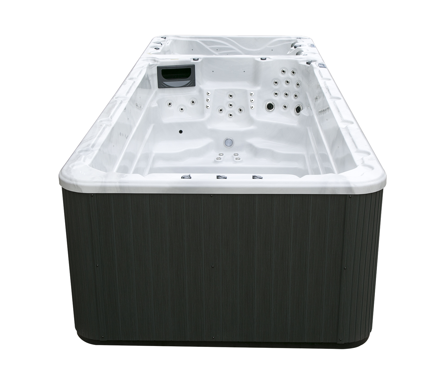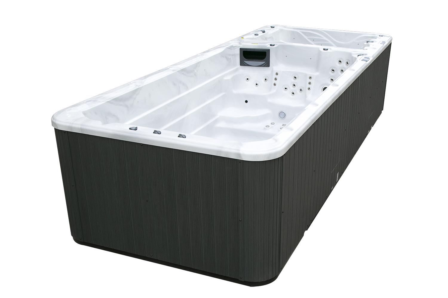 Два гидромассажных насоса по 1,5 кВт в сочетании с 76 форсунками обеспечивают интенсивный массаж и эффективную гидродинамику в спа-зоне. Мощный водяной насос на 2,9 кВт и форсунки противотока нового поколения создают идеальные условия для плавательных тренировок в главной части бассейна.